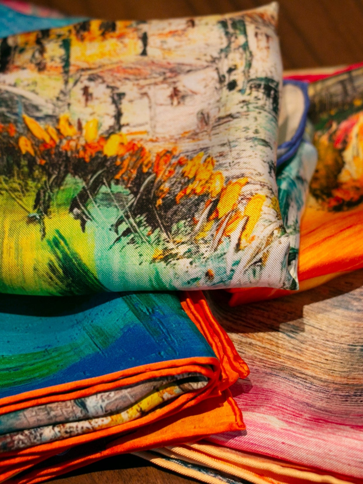 - Silk scarves can be hung in a wardrobe to prevent creasing, avoid humidity or direct sunlight to avoid fungal spots as well as fading of the scarf's colour.